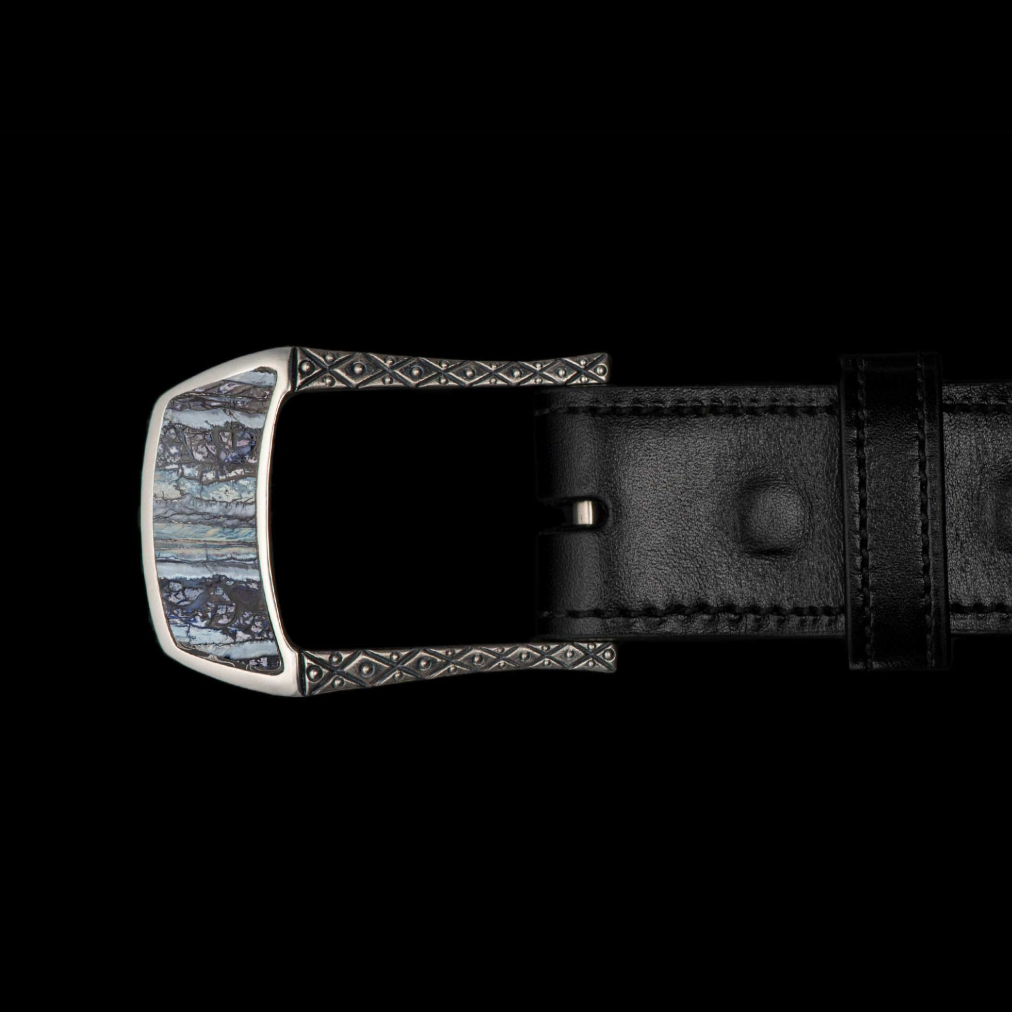 This beautiful belt buckle works from the street to the boardroom, and it creates an elegant accent to any attire. Sculpted in solid sterling silver, the highlight is an amazing inlay of blue Woolly Mammoth Tooth. Each inlay is hand-polished from a slice of the molar tooth of the Wooly Mammoth, the legendary creature that roamed Earth from 6000-10000 years ago. Fits any 1.25” (1 and ¼” wide) belt that allows for interchanging buckles.