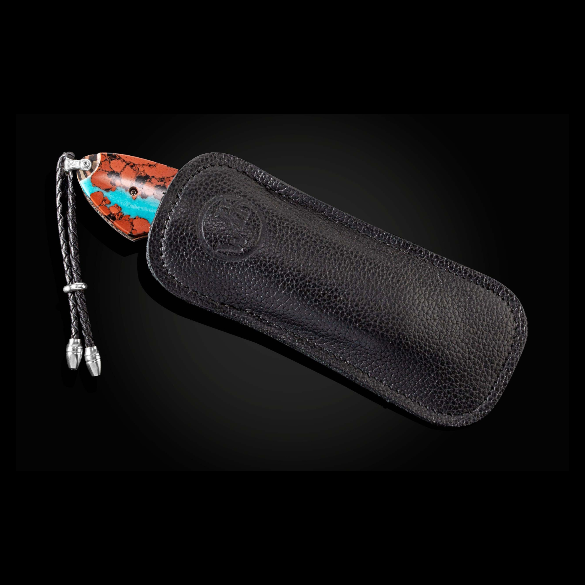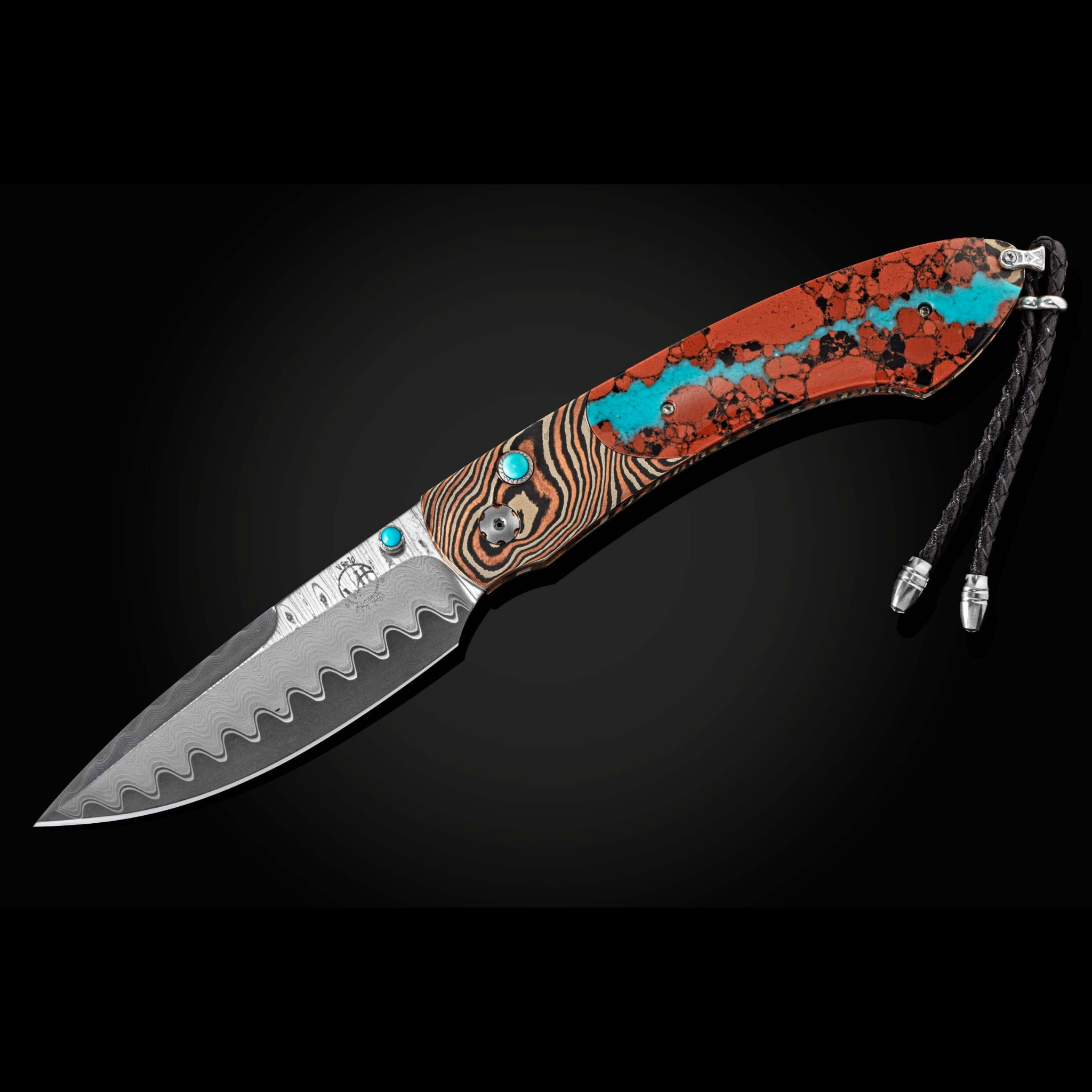 The Spearpoint 'Chuska' features a beautiful frame in 'Twist' Mokume by Mike Sakmar, inlaid with vein turquoise. The blade is William Henry's signature 'Wave' damascus steel with VG-10 core. The one-hand button lock and the thumb stud are set with turquoise cabochons. A remarkable design that gives you an instrument with a full-size secure grip, and a versatile deep-belly blade, the Spearpoint epitomizes William Henry’s core philosophy – that superlative function deserves to be elevated to superlative art. The 'Chuska' features some of William Henry's most admired and distinctive forged metals; a timeless heirloom to be proudly worn and used for a lifetime before being handed-down to another generation.