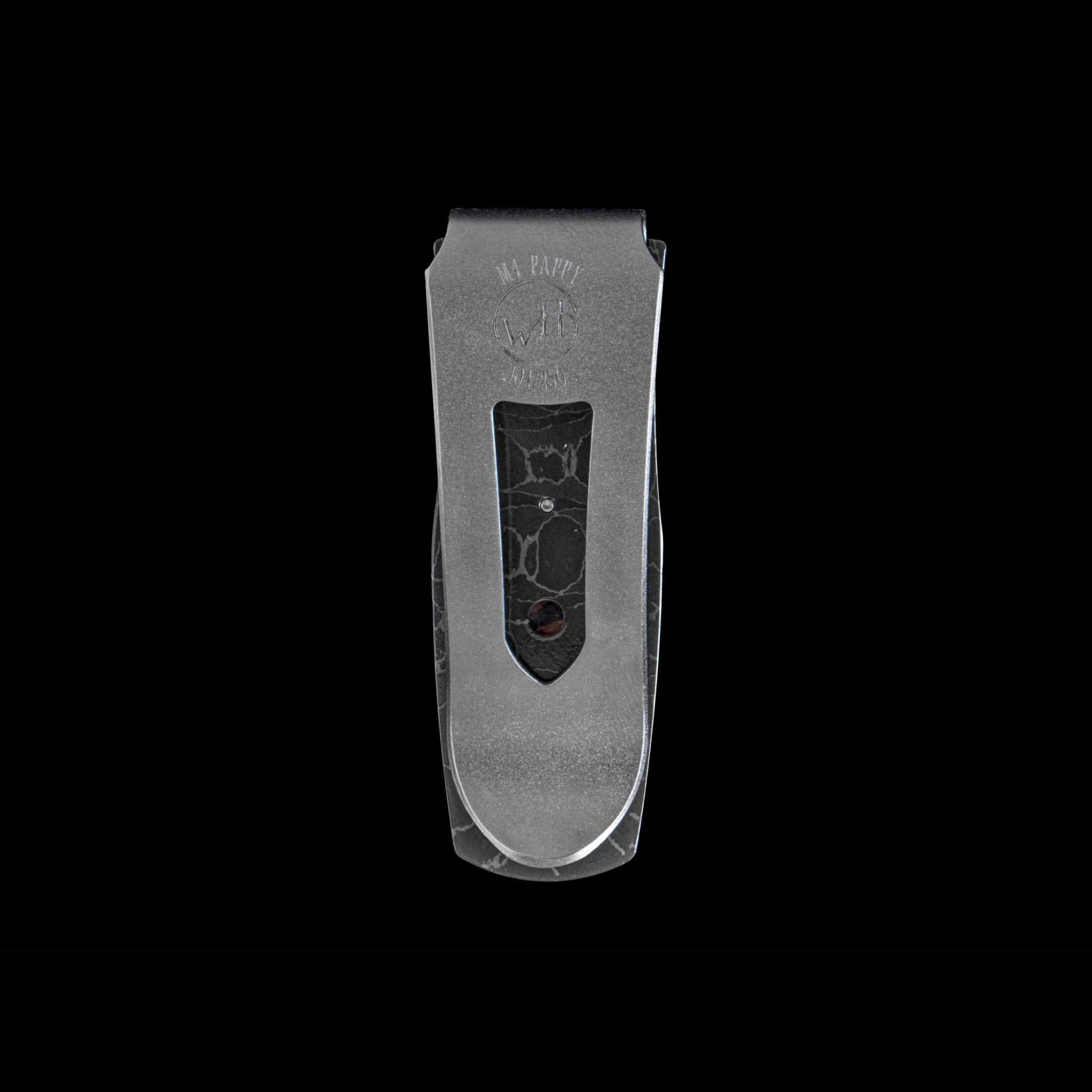 The Pharaoh ‘Pappy’ exudes sophistication with a frame crafted from T-Rex Damascus by renowned artisan Delbert Ealy, enhanced with an exquisite inlay of Pappy Van Winkle barrel wood. The clip, meticulously machined and blast-polished from tempered stainless steel, boasts a stunning engraving bright cut against its matte-finished background. Inspired by the timeless designs of ancient Egypt, our Pharaoh money clip channels the graceful vessel forms of antiquity into a collection that is both refined and captivating. Available in an array of our signature materials and employing the finest techniques, it stands as a testament to enduring elegance and legacy.