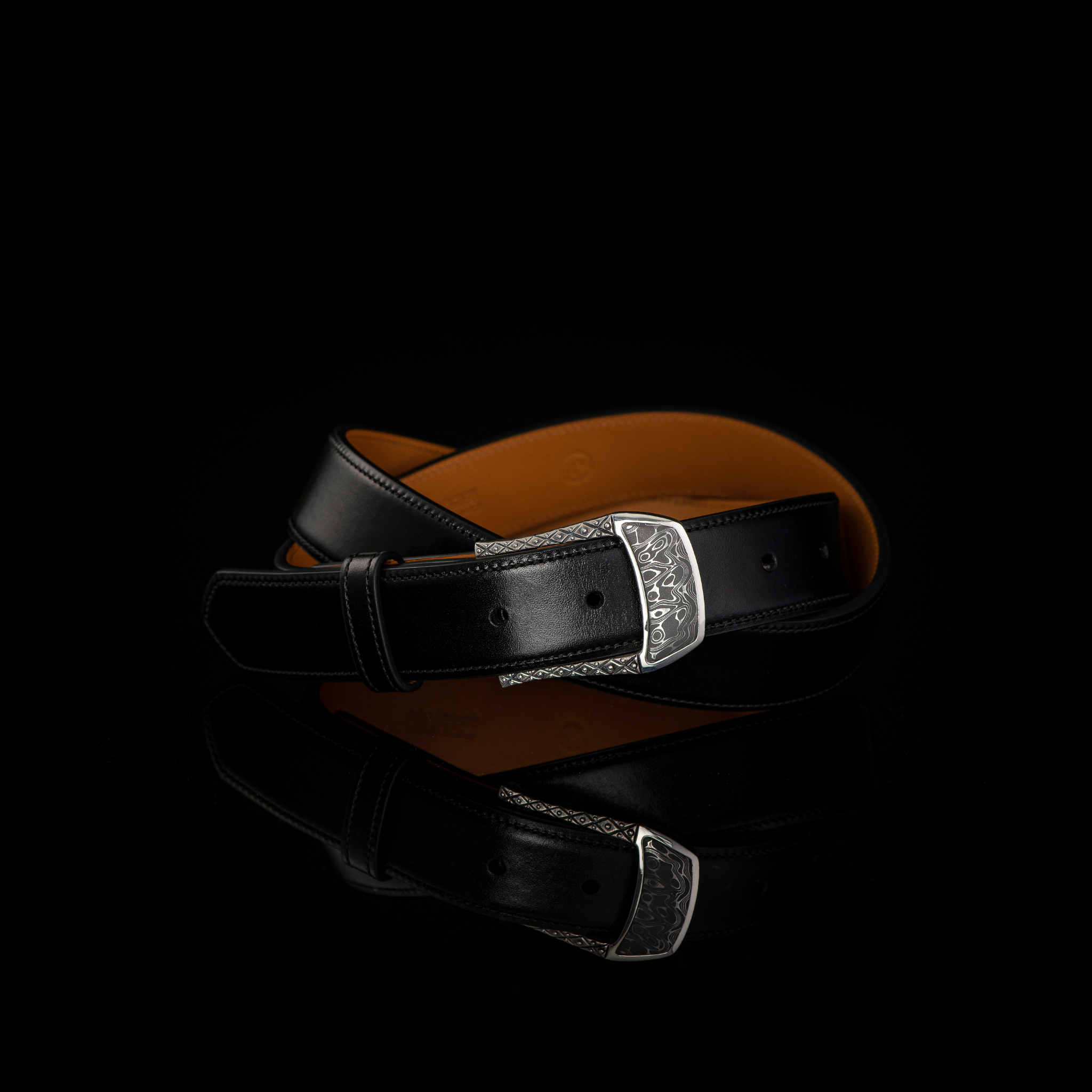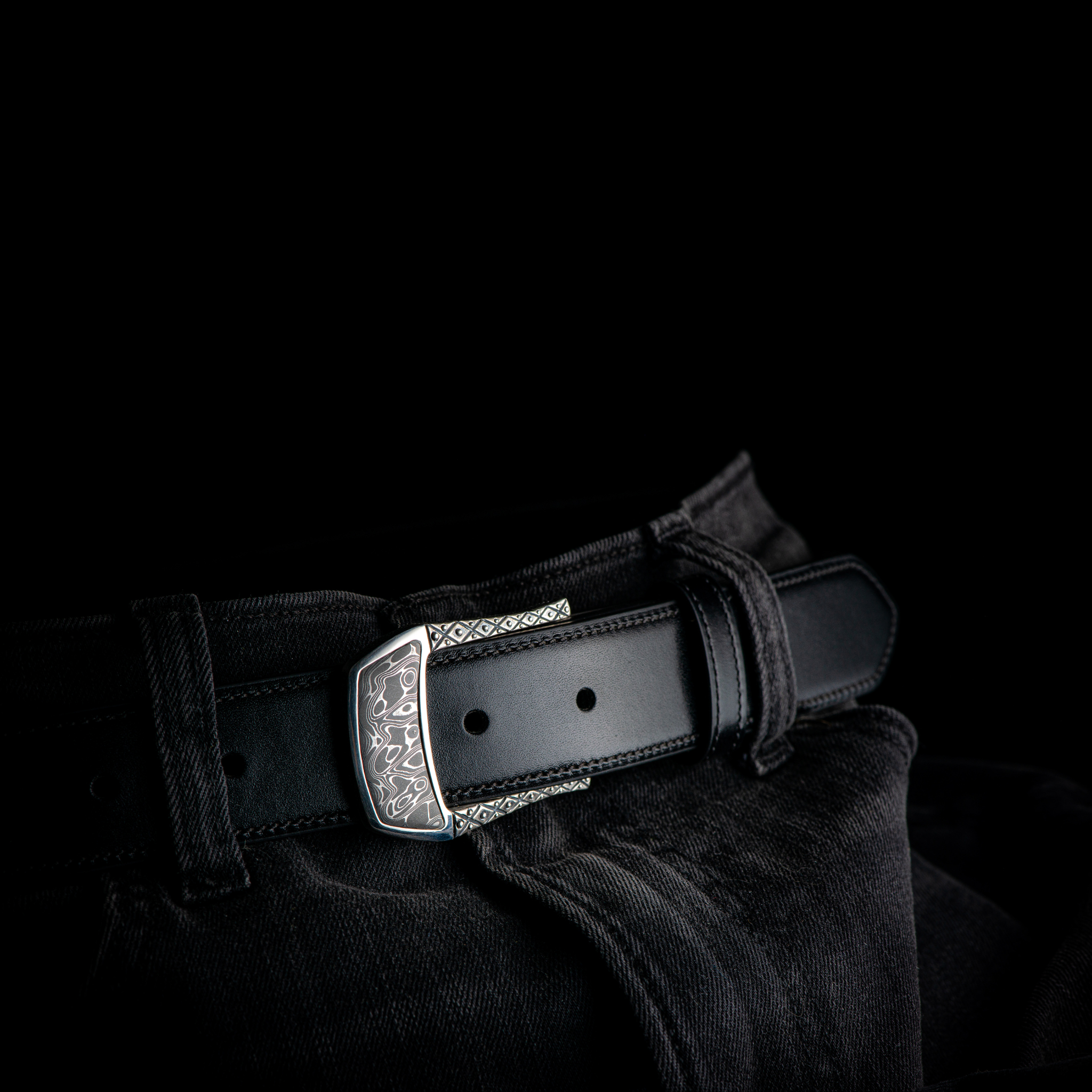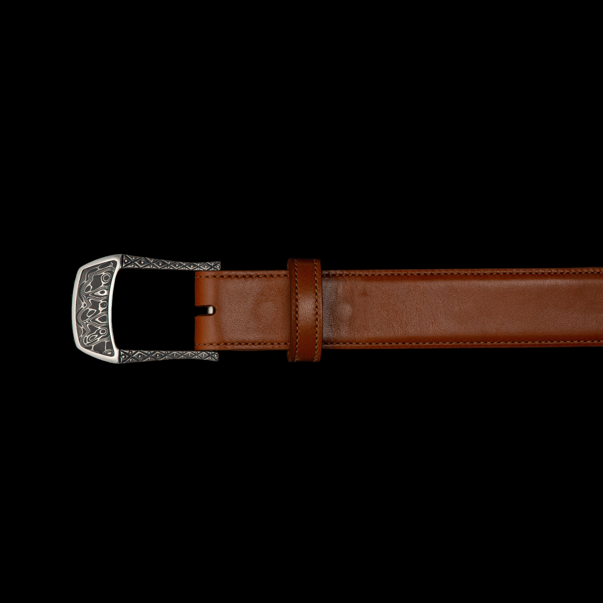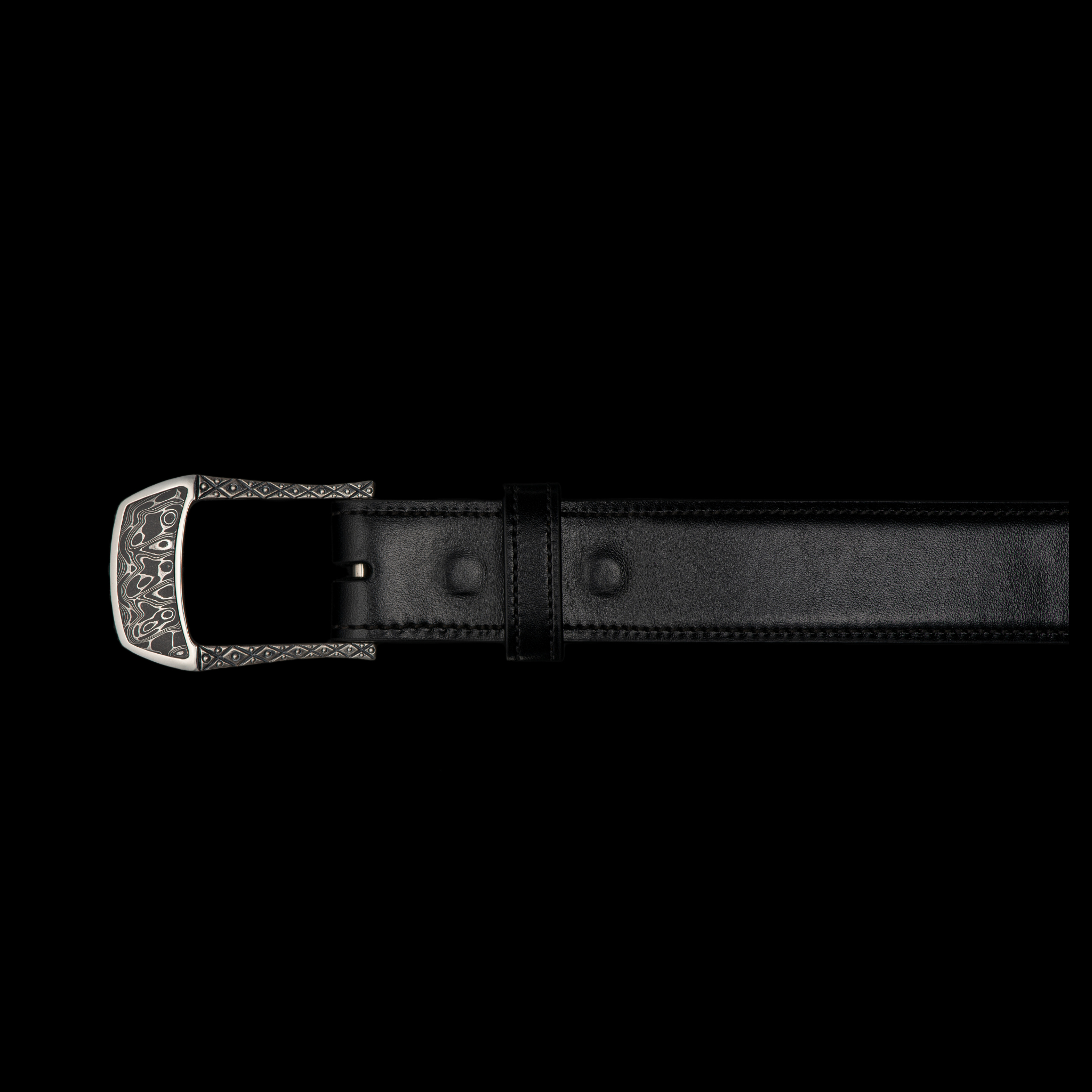 This beautiful belt buckle works from the street to the boardroom, and it creates an elegant accent to any attire. Sculpted in solid sterling silver, the highlight is a striking inlay of hand-forged stainless Damascus steel (our Intrepid pattern). 140 layers of three different alloys forged into one tapestry in steel, heat treated, etched and polished to reveal the unique pattern as the alloys dance together. Fits any 1.25” (1 and ¼” wide) belt that allows for interchanging buckles.