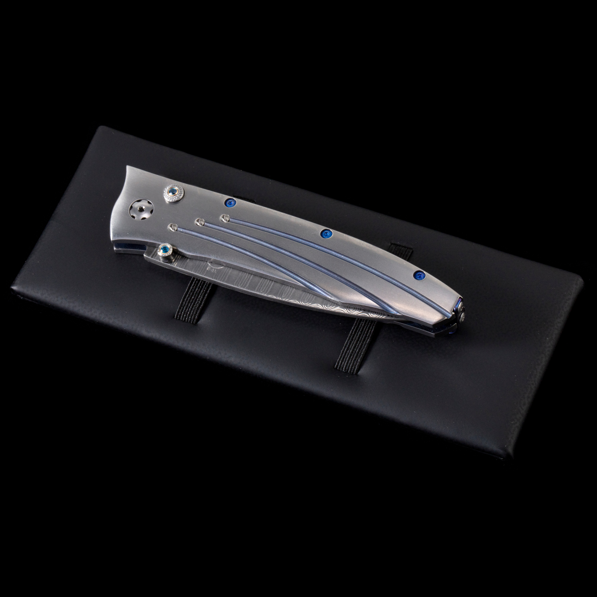 The Gentac ‘Saturn’ features a light and resilient frame in aerospace grade titanium, and a titanium pocket clip. The blade is extra-strong ZDP-189 steel; the one-hand button lock and the thumb stud are set with kashmir blue topaz.