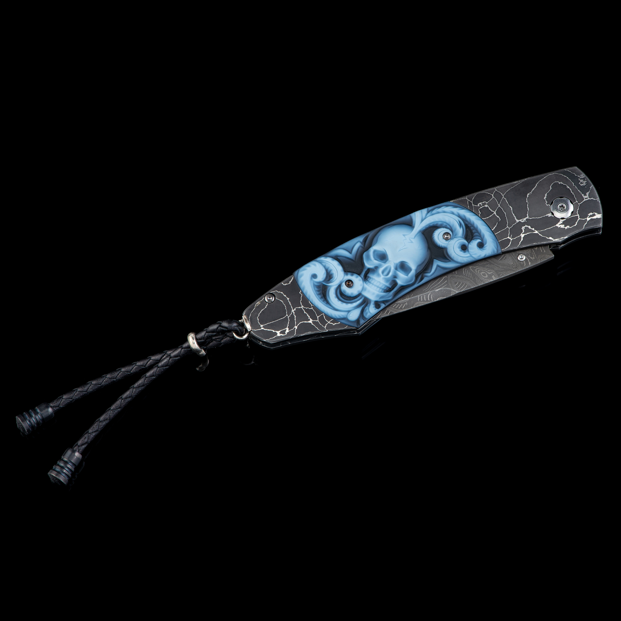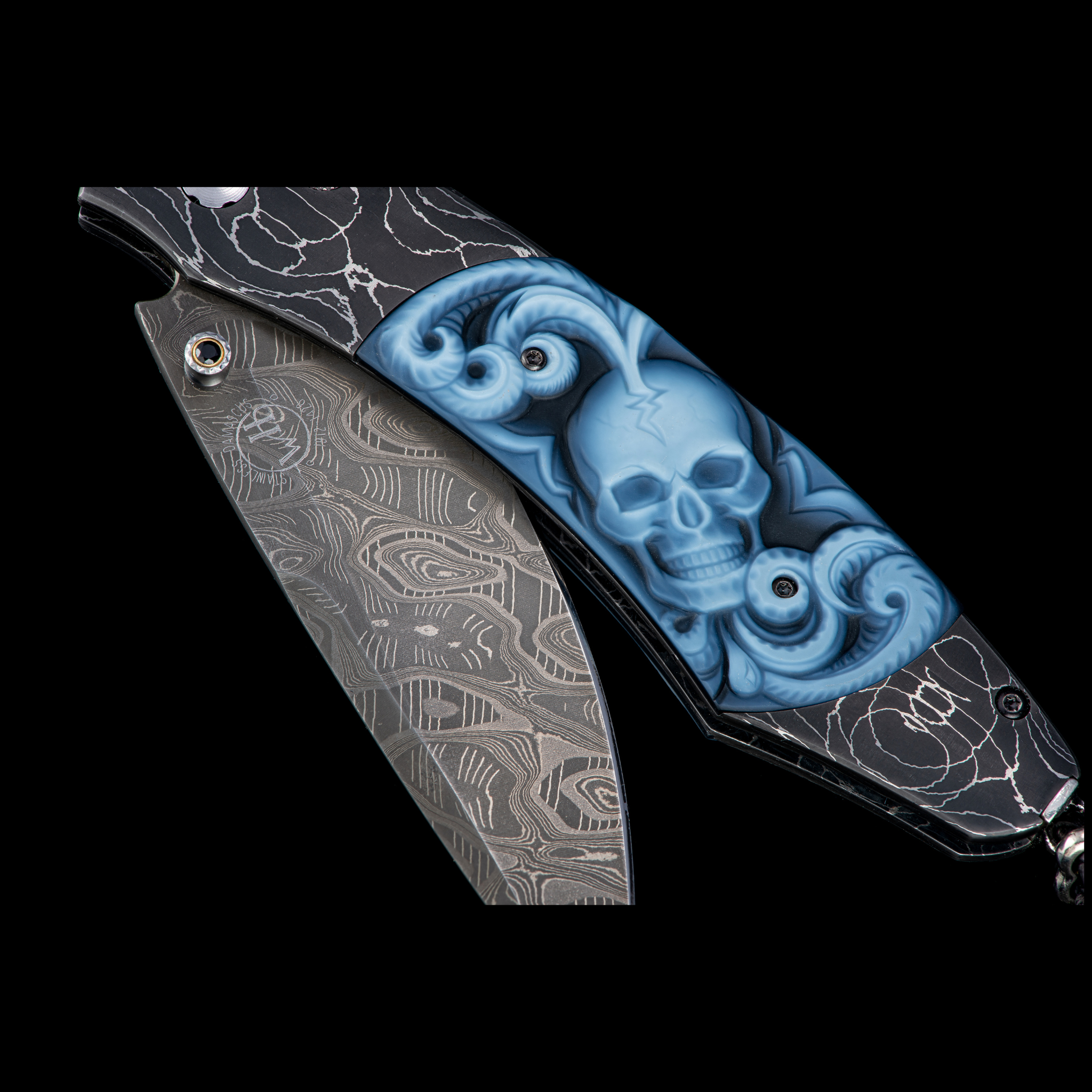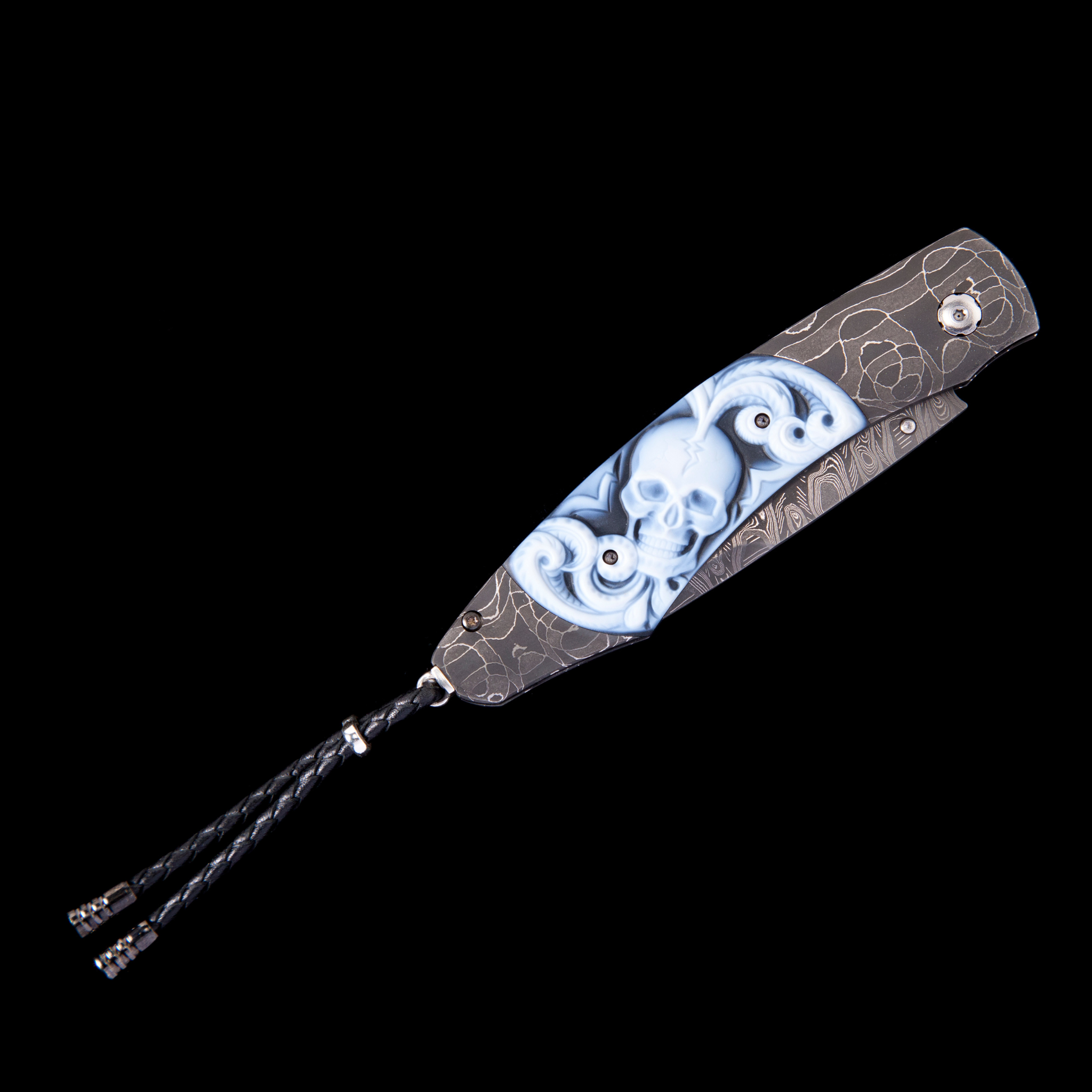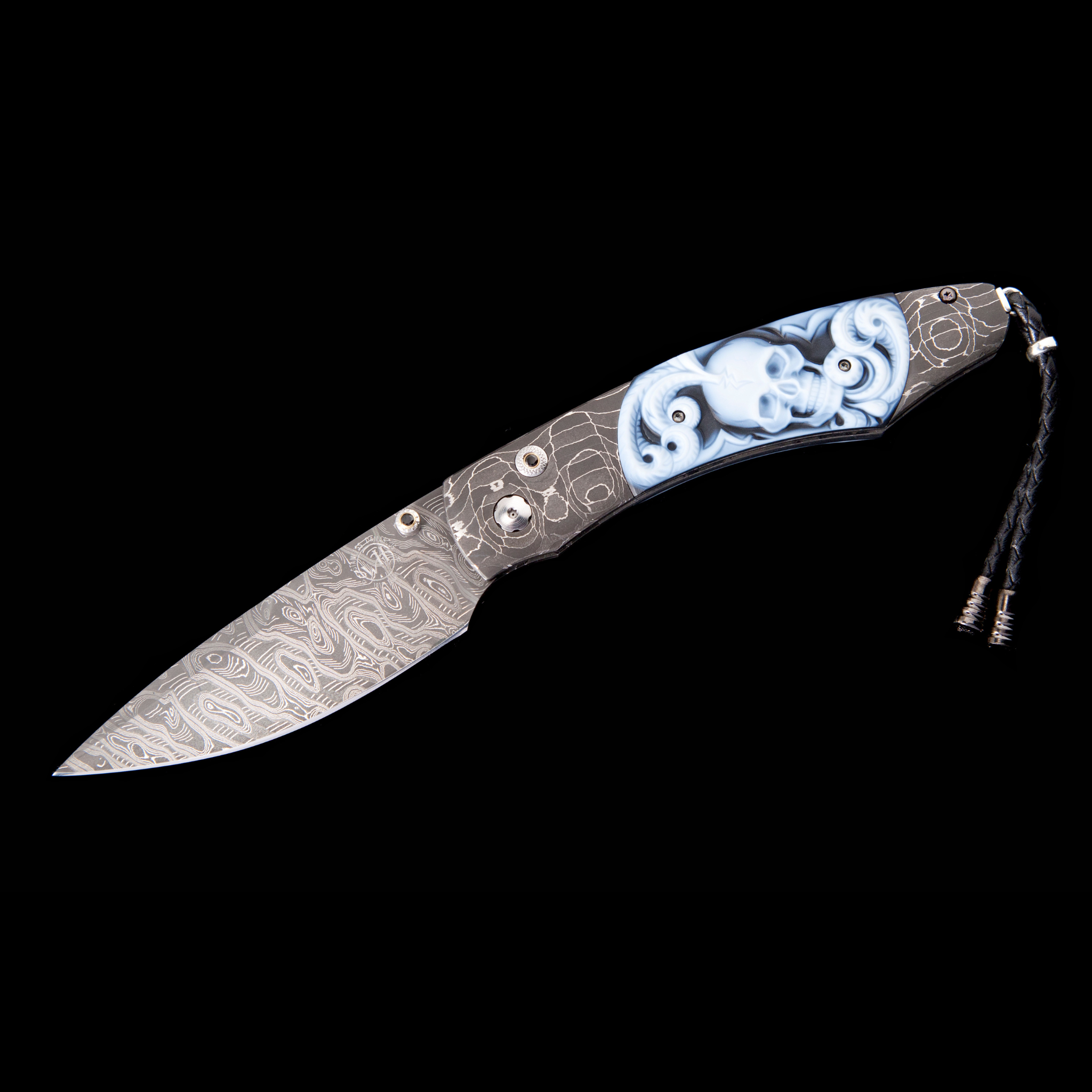 The Spearpoint 'Belfry' features a frame of hand-forged 'T-rex' damascus by Delbert Ealy, inlaid with beautiful carved banded agate scales. The blade is hand-forged 'Hornets Nest' damascus by Mike Norris; the one-hand button lock and the thumb stud are set with black onyx gemstones. A remarkable design that gives you an instrument with a full-size secure grip, and a versatile deep-belly blade, the Spearpoint epitomizes William Henry’s core philosophy – that superlative function deserves to be elevated to superlative art. The ‘Belfry’ features the artistry, hi-tech, and hand-forged metals that are the hallmark of William Henry's collections; a distinctive personality statement to be worn and used for a lifetime.