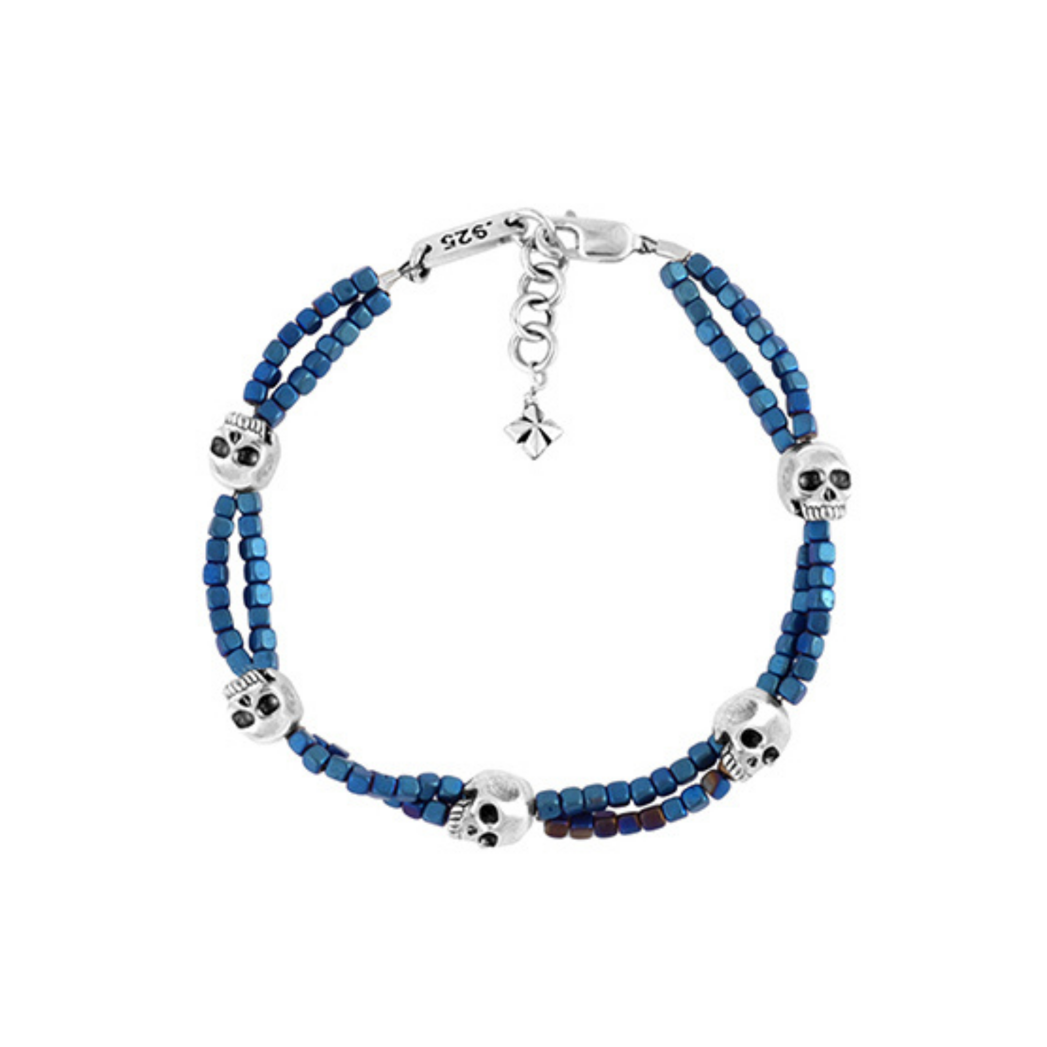 Blue Square Hematite Double Strand Bracelet with Skulls