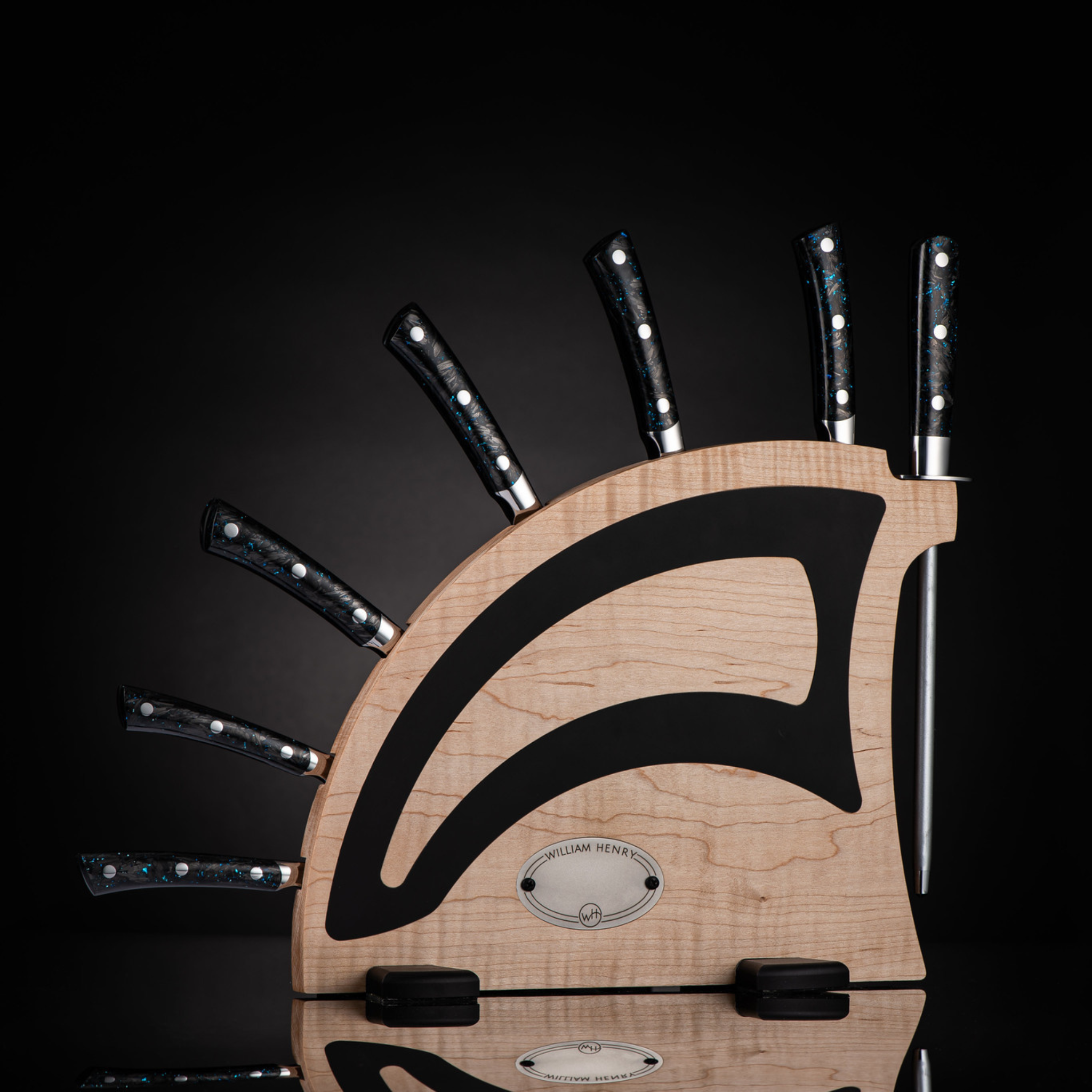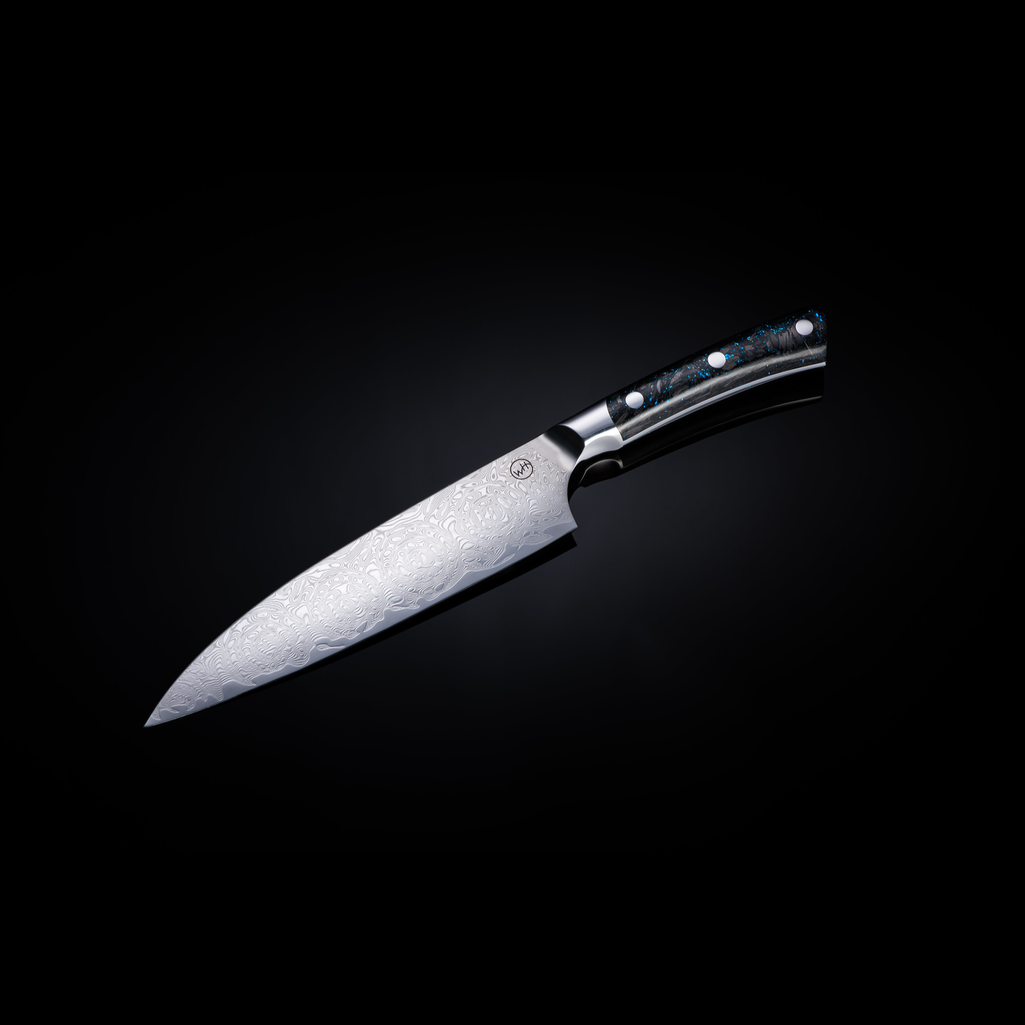 The Kultro Pro Series is robust and rugged, built to commercial grade specs but worthy of the finest kitchens. The set includes six knives ranging from paring to 9.5” chefs, each finely crafted from forged stainless damascus steel. This gorgeous material features 103 layers, 51 layers of stainless steel on each side of a core of 10Cr15V, an edge steel that is vacuum heat treated and tempered to an optimal hardness of HRC 60 for sharpness, wear resistance, and superior performance. The damascus blades are seamlessly welded into stainless bolsters and a full tang, with compressed carbon fiber handles secured by stainless pins. Visually stunning, razor sharp, beautifully weighted and balanced, these are tools elevated to art. A matching diamond coated sharpener completes the set, which is shipped in its own professional grade leather roll with protective blade covers.